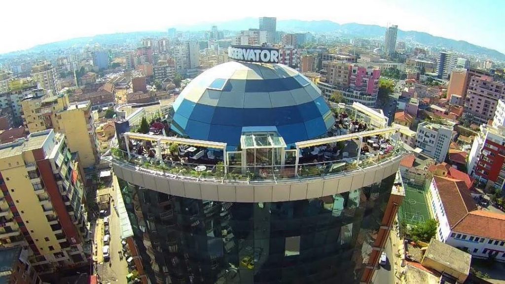 Tavanë brenda-jashtë, duke ofruar pamje mahnitëse 360° mbi Tiranën përreth.