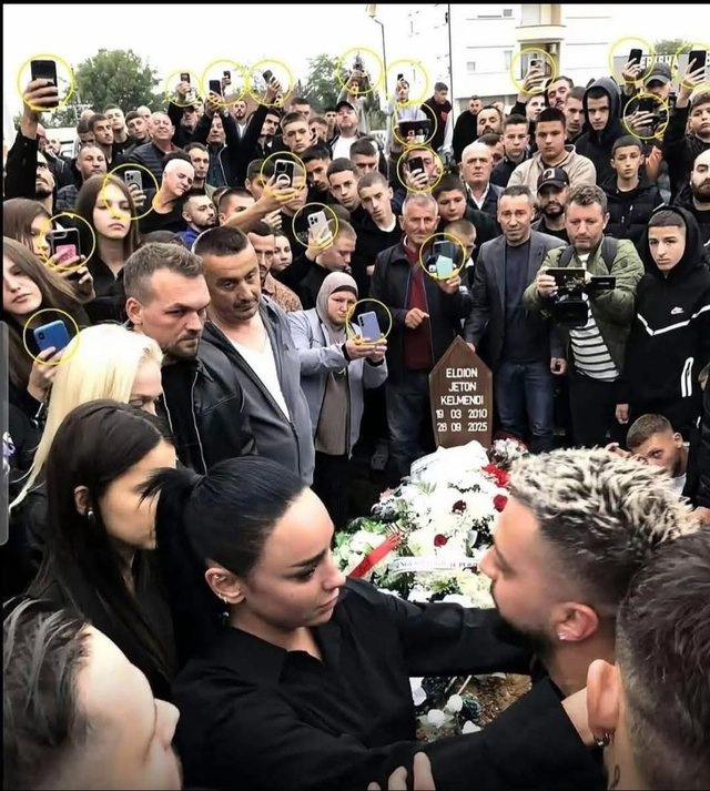 Në një fotografi të shpërndarë nga ceremonia, duket qartë se shumë të pranishëm e shfrytëzuan momentin për të filmuar ose fotografuar, duke i drejtuar telefonat e tyre ndaj ngushëllimeve mes familjarëve, një akt që ka ngjallur reagime të shumta në rrjetet sociale.