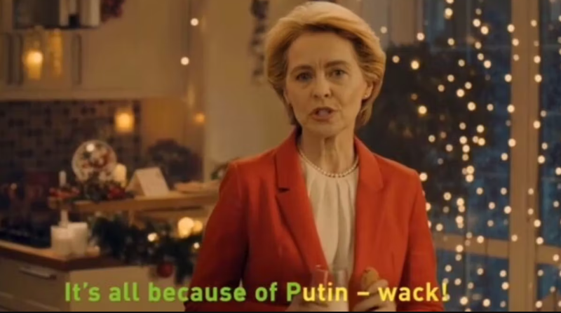 Teksti i këngës thekson ironikisht se e gjithë kjo “është faji i Putinit “. Në reklamë shfaqet edhe Presidentja e Komisionit të BE-së, Ursula von der Leyen.
